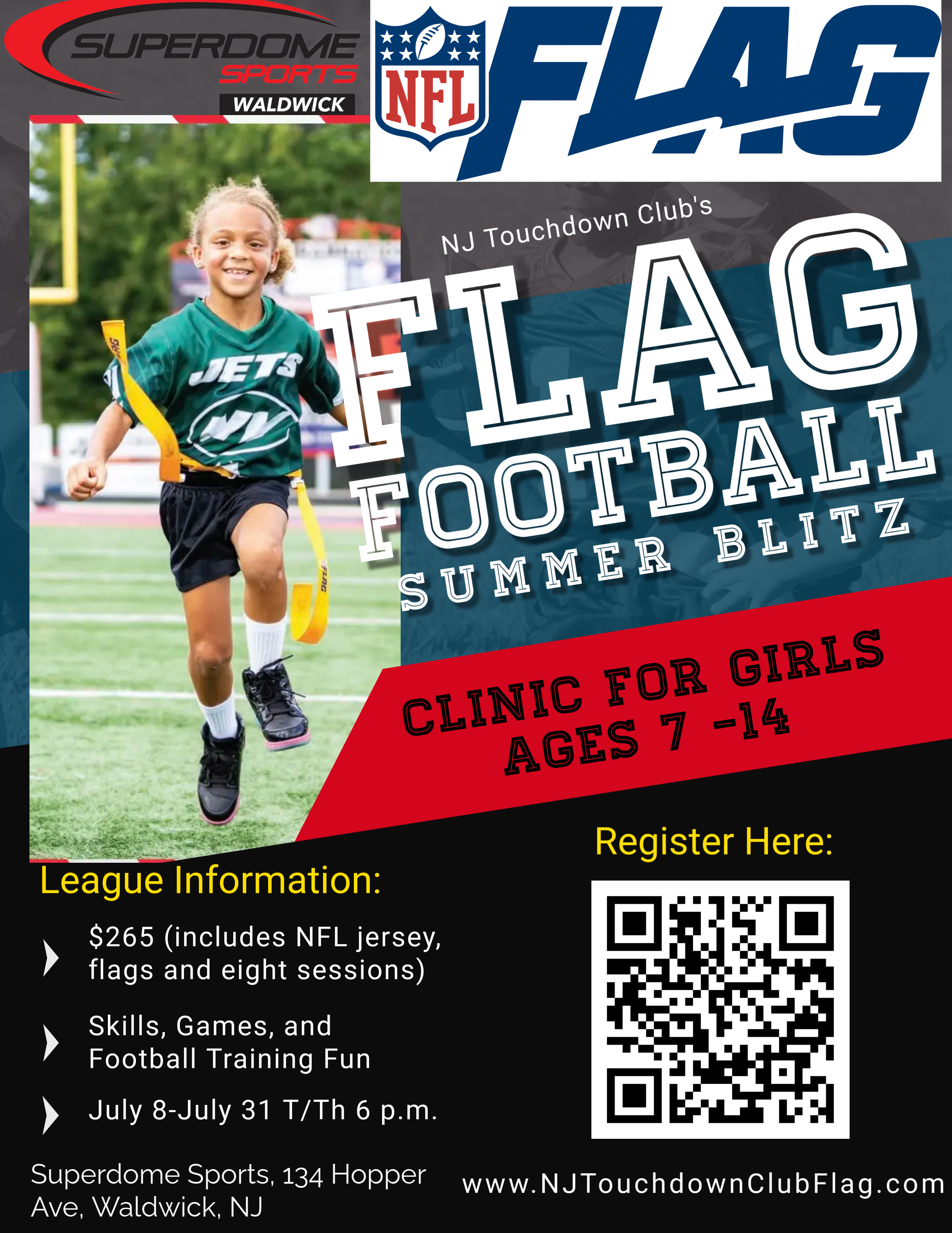 This summer, join our exciting NFL Flag Football Girls Clinic at the Superdome Summer Blitz, powered by NFL Flag and the NJ Touchdown Club! Open to all skill levels, the clinic focuses on building core fundamentals like passing, catching, route running, and defense through engaging drills, small-sided games, and fun team challenges. With NFL Flag involved, every participant will receive an official NFL reversible game jersey and experience a pro-level atmosphere designed to boost confidence, teamwork, and a love for the game. It’s the perfect mix of skill-building and summer fun!